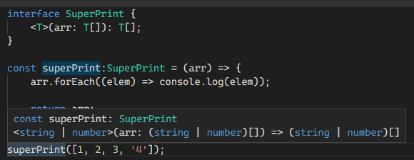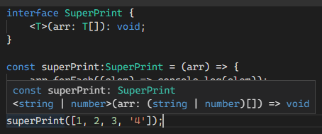 superPrint([1, 2, 3]);- 함수 타입을 정의할 때, 어떤 배열을 처리할 것인지만 뒤에 붙여주면 된다.