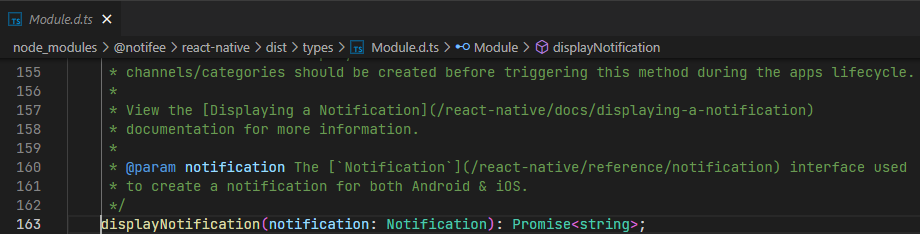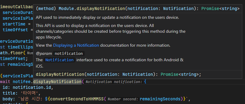 notifee라는 알람 라이브러리에서 제공하는 메서드인데, IDE 에서 인자로 무엇을 주어야 할지, 반환값은 무엇이 나오는지 알려주고 있다. - 이는 IDE 가 자동으로 작성한 것이 아니라, 라이브러리 제작자가 힘들게