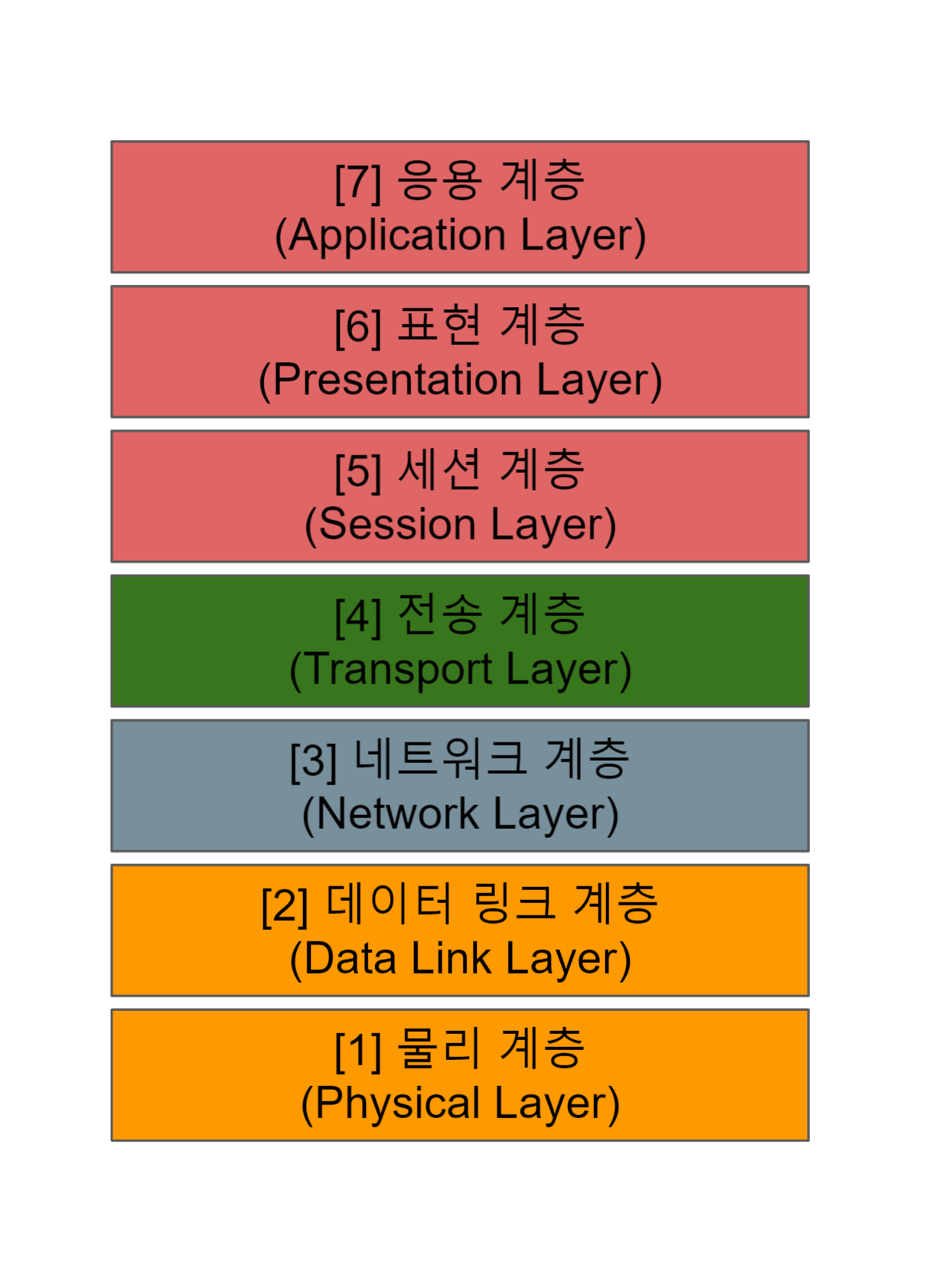 위 그림은 OSI 7계층의 각 계층을 아래서 위로 순서대로 정리한 것이다.