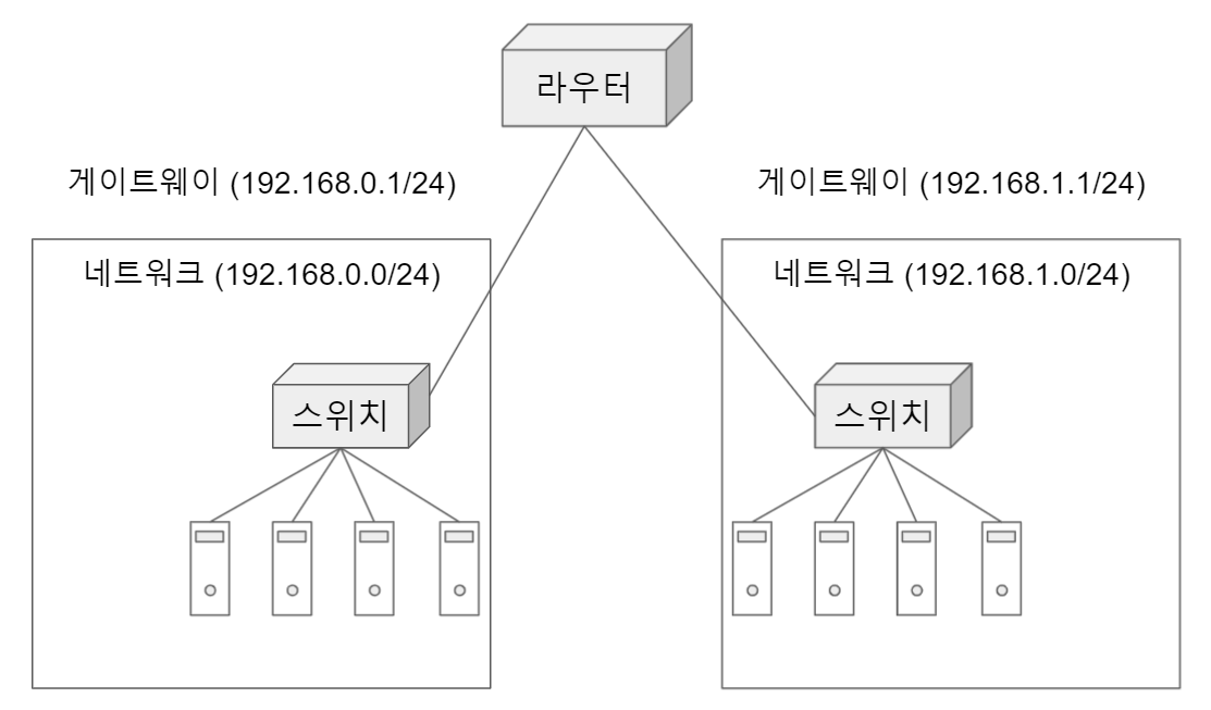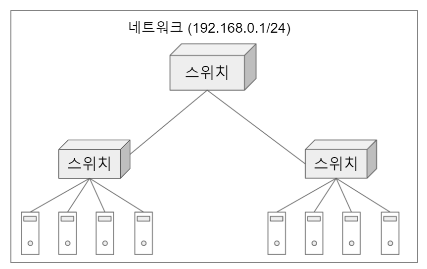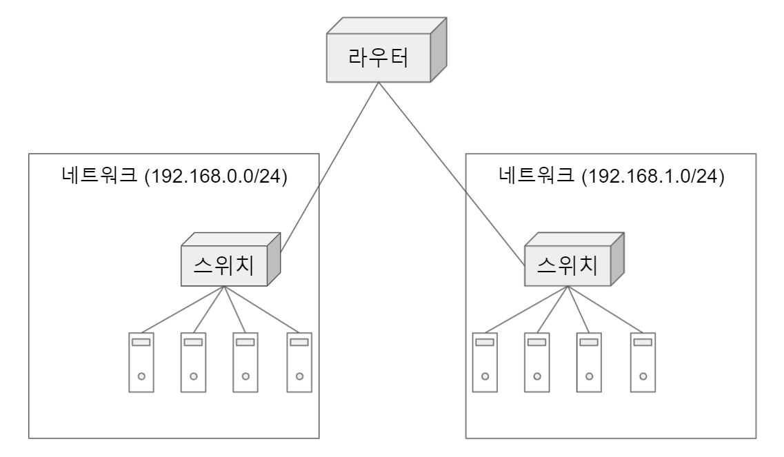 그렇다면 서로 다른 네트워크 란 무엇을 말하는 것일까? 네트워크란 말 자체가 워낙 포괄적인 의미가 있지만, 여기서는 2계층을 공부할 때 배웠던 스위치로 연결된 컴퓨터들의 집합을 1개의 네트워크 라고 하자.