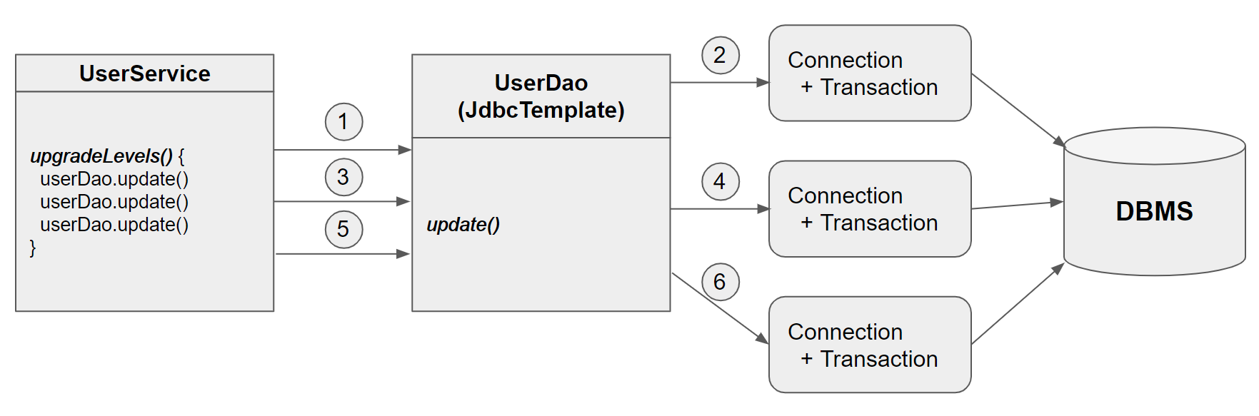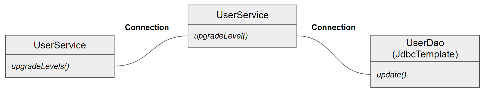 현재 UserDao에서는 소위 CRUD라고 말하는 기능만 제공한다. 그 외에 어떠한 비즈니스 로직도 제공하지 않는다. 새로운 요구사항이 들어와서 단지 정보를 넣고 검색하는 것 외에도 정기적으로 사용자의 활동내역을 참고해서 레벨을 조정해주는 기능이 필요하다고 가정해보자.