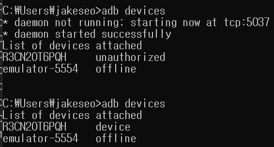 허용 을 누르고, 다시 adb devices 명령어를 치면 이후에는 unauthorized 가 아니라 아래와 같이 device 라고 표기된다.