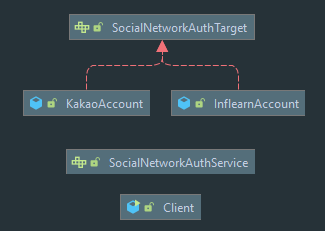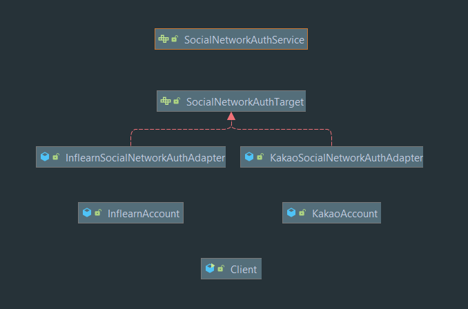 InflearnAccount와KakaoAccount가Adaptee에 해당하는 역할을 한다.- 다이어그램엔 나타나있지 않지만, 각