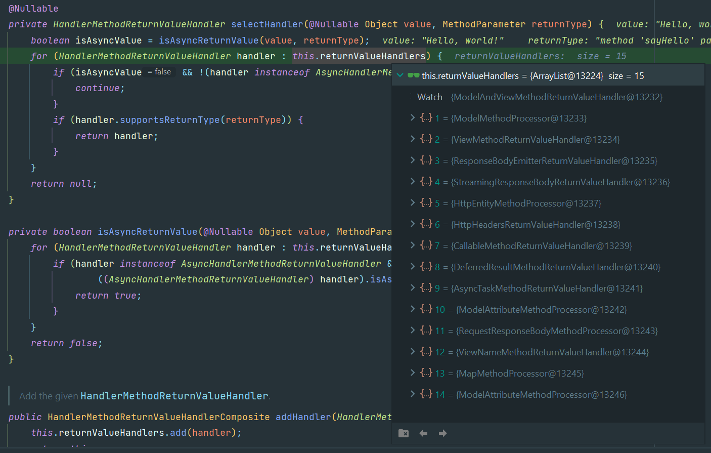 this.returnValueHandlers에는 무려 15개의returnValueHandler가 담겨있다.