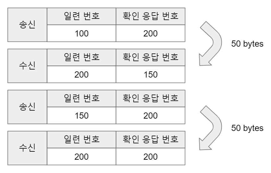 위와 같은 형식으로 이용된다. 위는 한 번에 데이터를 50바이트만큼 전송하는 예시이다. 50바이트와 같이 한번에 전송되는 데이터의 단위를 세그먼트라고 한다.