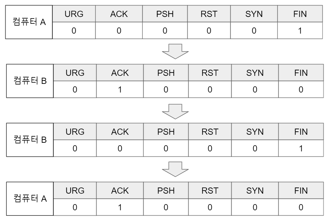연결 종료 시에는 FIN -> ACK -> FIN -> ACK의 4단계 절차가 일어난다.