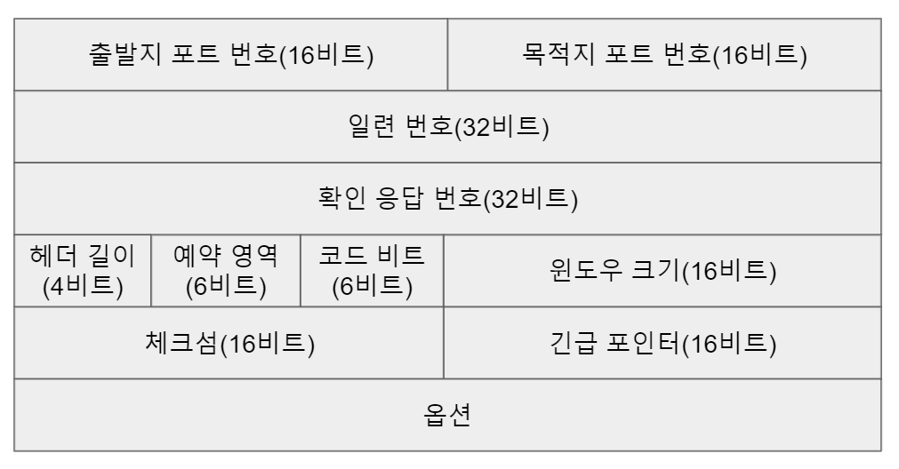 TCP 헤더는 위와 같은 구성으로 이루어져있다. 검증 절차를 가져야 하므로 그에 필요한 정보 때문에 UDP보다 상대적으로 복잡한 헤더를 갖는다.