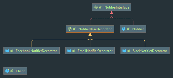 decorate메서드와facebookEnabled메서드를 시범삼아 구현해보았다. decorate메서드는 리플렉트를 통한 일반화 방식이고,NotifierBaseDecorator를 상속한 어떤 클래스든 넣을 수 있다.facebookEnabled는 유저 친화적인 방식으로 메서드를 구현한 것이다.
