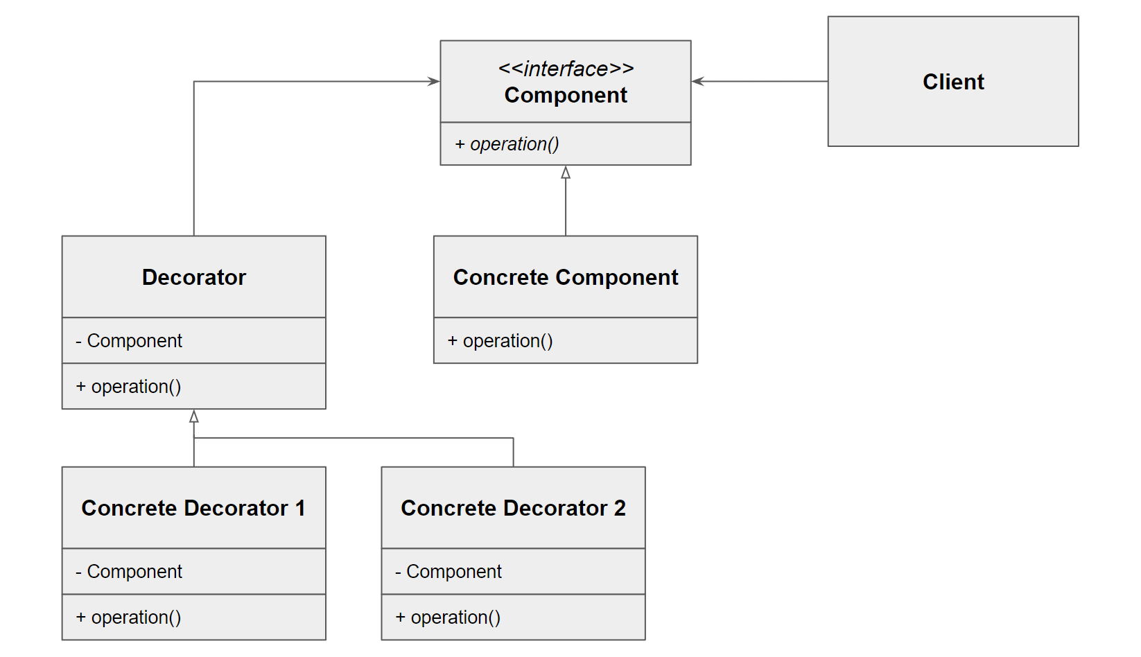 Component가 이전의PizzaService에 해당한다.Concrete Component는DefaultPizza이다.Decorator는PizzaDecoratorConcrete Decorator가 각각CheeseDecorator,BulgogiDecorator이다.