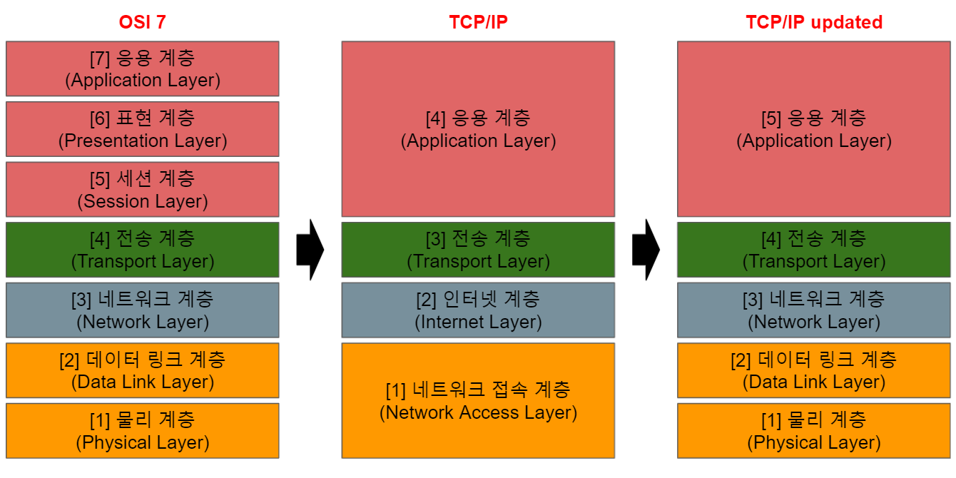 위의 그림은 3개의 모델 변천사를 정리해본 것이다. 최종 모델인 TCP/IP updated 모델을 보면, 4계층 밑으로는 OSI 7계층과 동일하며, 5, 6, 7 계층을 응용 계층(Application Layer)이라는 이름으로 통합했다.